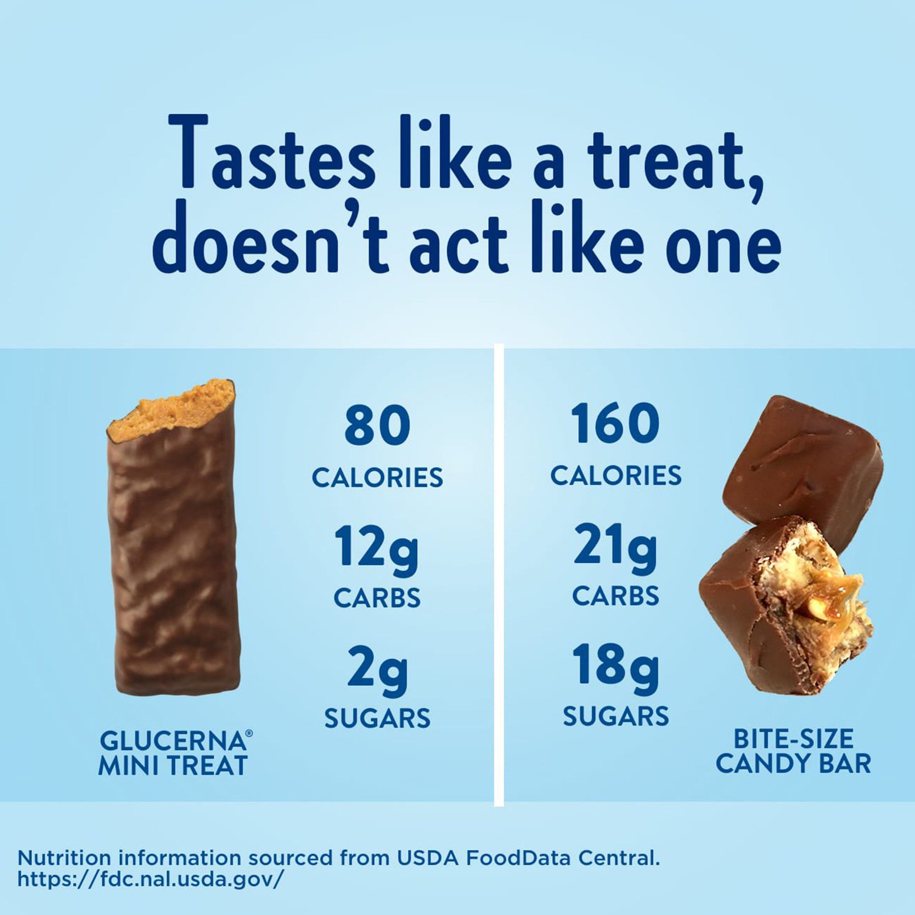 - One Glucerna Mini-Treat has half the calories of a bite-size candy bar; 57% of the carbs of a bite-size candy bar and only one-ninth of the sugar of a bite-size candy bar
